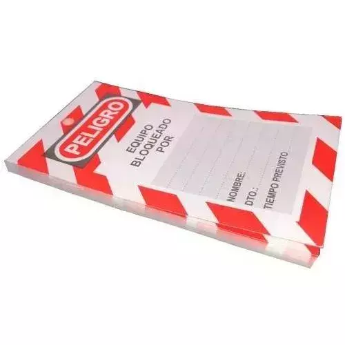 Block de 30 tarjetas descartables de cartulina ilustración. Impresa de ambos lados con la leyenda "PELIGRO NO OPERAR" y espacio para anotar los datos de la persona responsable del bloqueo.
